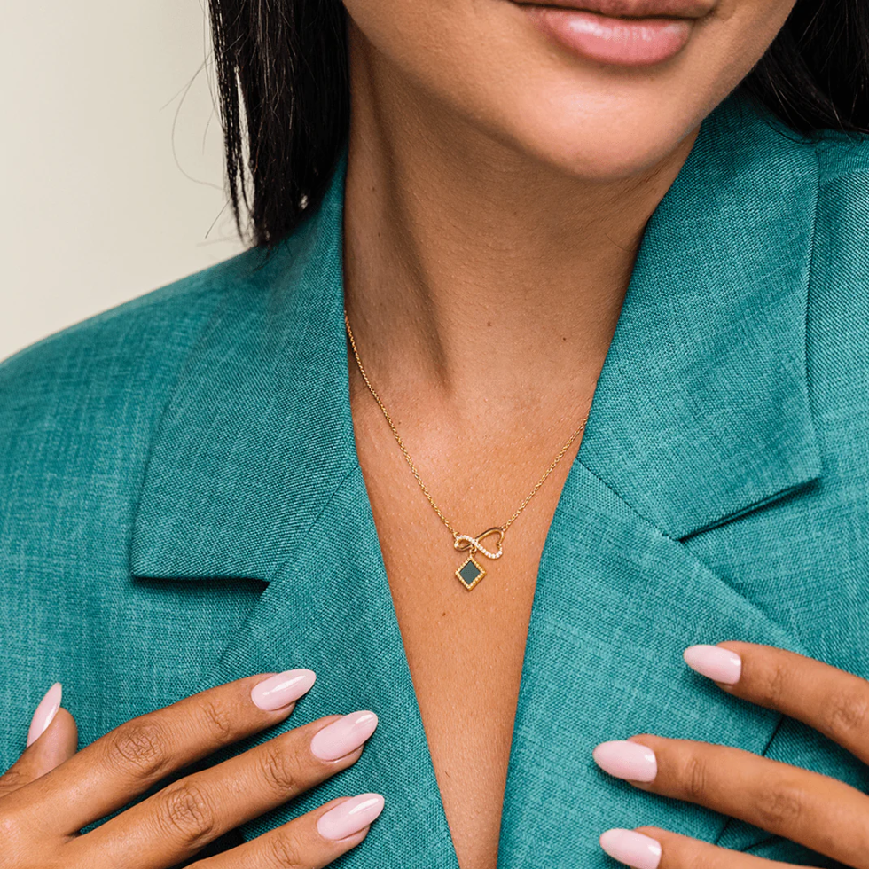 Pingente: Símbolo do Infinito com zircônias e detalhe central com nano Bíblia