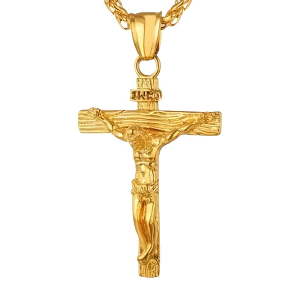 Eleve sua fé com elegância com o colar crucifixo INRI em aço inox dourado. Com acabamento premium e banho PVD resistente, essa joia católica combina espiritualidade, estilo e durabilidade.