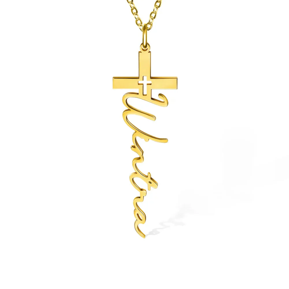Este colar apresenta um design exclusivo que une a elegância da cruz com o toque pessoal de um nome personalizado.